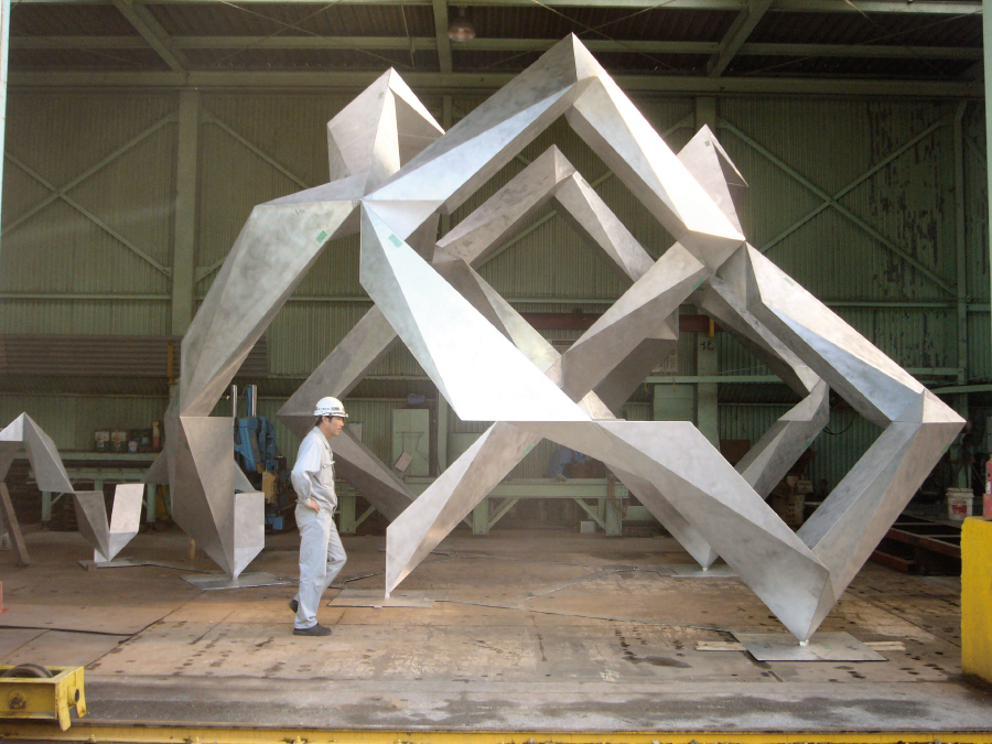 アルミ合金で作られた三次元スクリーン。プロジェクターからの映像を、プリズムで反射させたかのように映し出す。