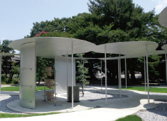 | コンセプト | 花びらのような屋根をもった納骨堂、細い支柱で支えられたその屋根からは、宙に浮いているような軽やかな印象を受ける。 |