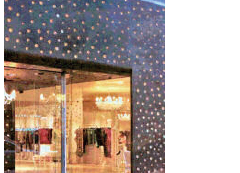 | 仕 様 | ハニカム構造の鋼板と採光を目的として、アクリルが一体となった面で、エントランスファサードが構成されている。日中は、アクリルを通して店内に陽光が注ぎ込み、夜は店内照明により光が街並みに放たれる。 |